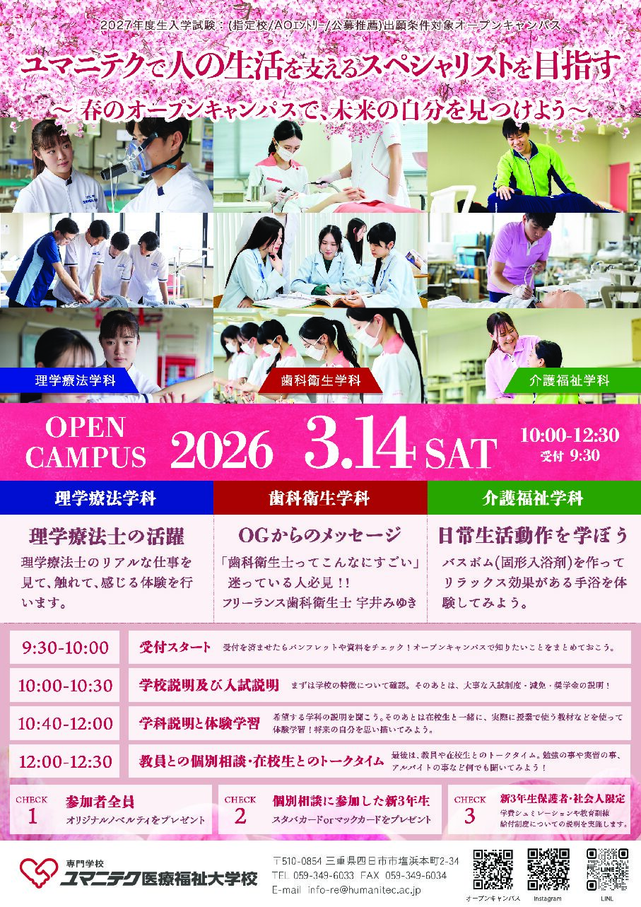 🌸3月14日(土)オープンキャンパス開催のお知らせ🌸2027年度入学試験の出願対象条件オープンキャンパスとなります! 進路選びが本格化する4月直前。